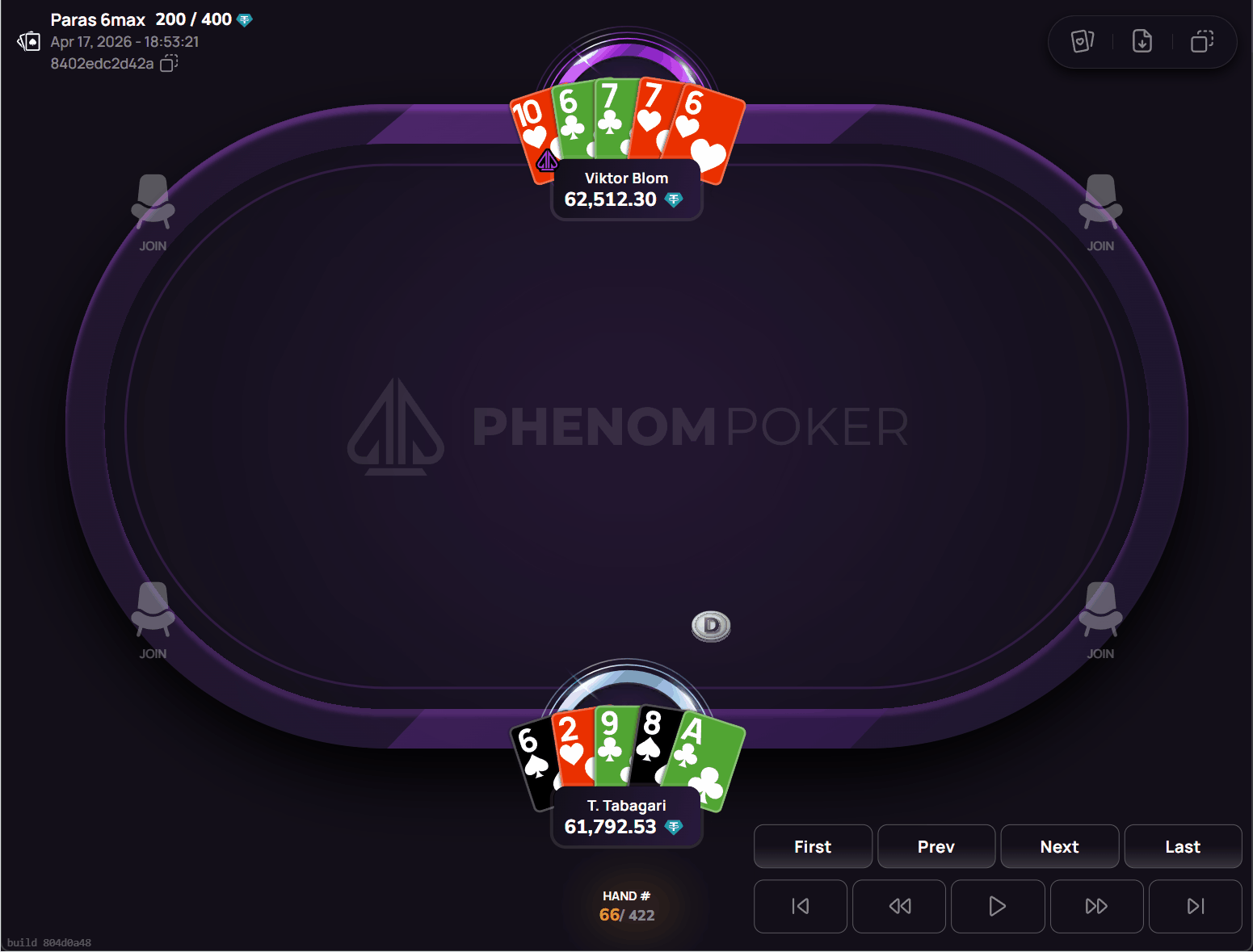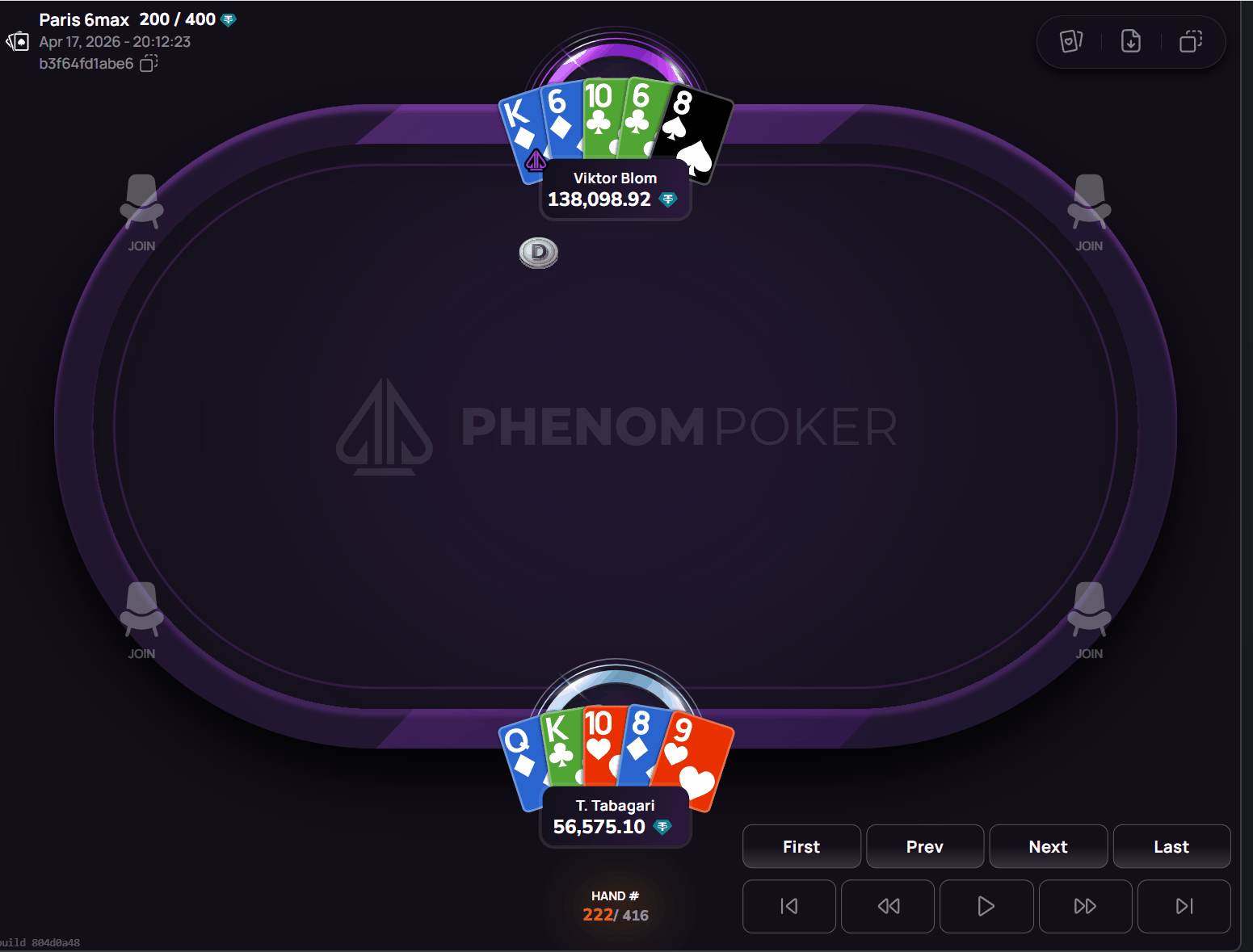 The K♠️-J♠️-6♥️ flop connected with Blom's K♦️-6♦️-T♣️-6♣️-8♠️ in multiple ways: a pair of kings alongside a set of sixes, using both pocket sixes with the 6♥️ on board. Tabagari held K♣️ with top pair and a strong wrap draw combining his Q♦️-T♥️-8♦️-9♥️. He called bets on the flop and turn, but the 4♣️-3♠️ runout did not complete his draws. Blom's set of sixes took down the 56,568 USDT pot.