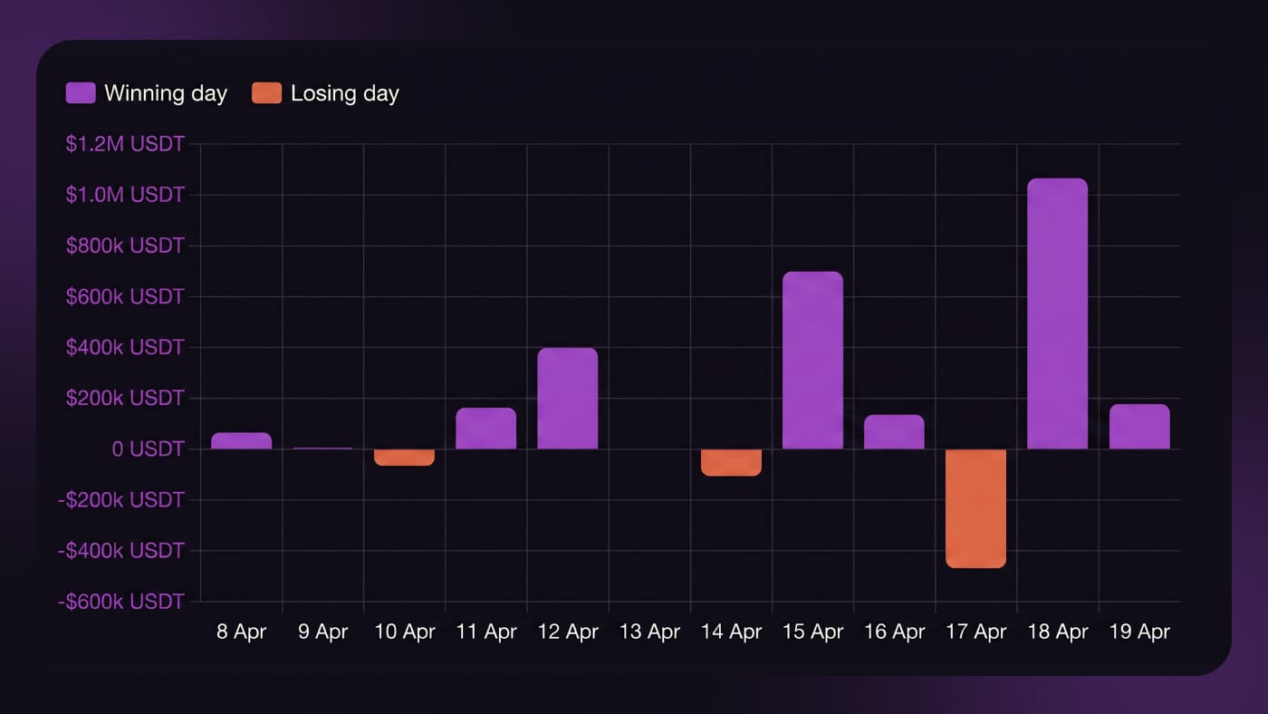 7 winning days · 3 losing days · 1 day off (Apr 13). A 451K USDT loss on Friday followed by a 1.07M USDT win on Saturday. Vintage Isildur1.