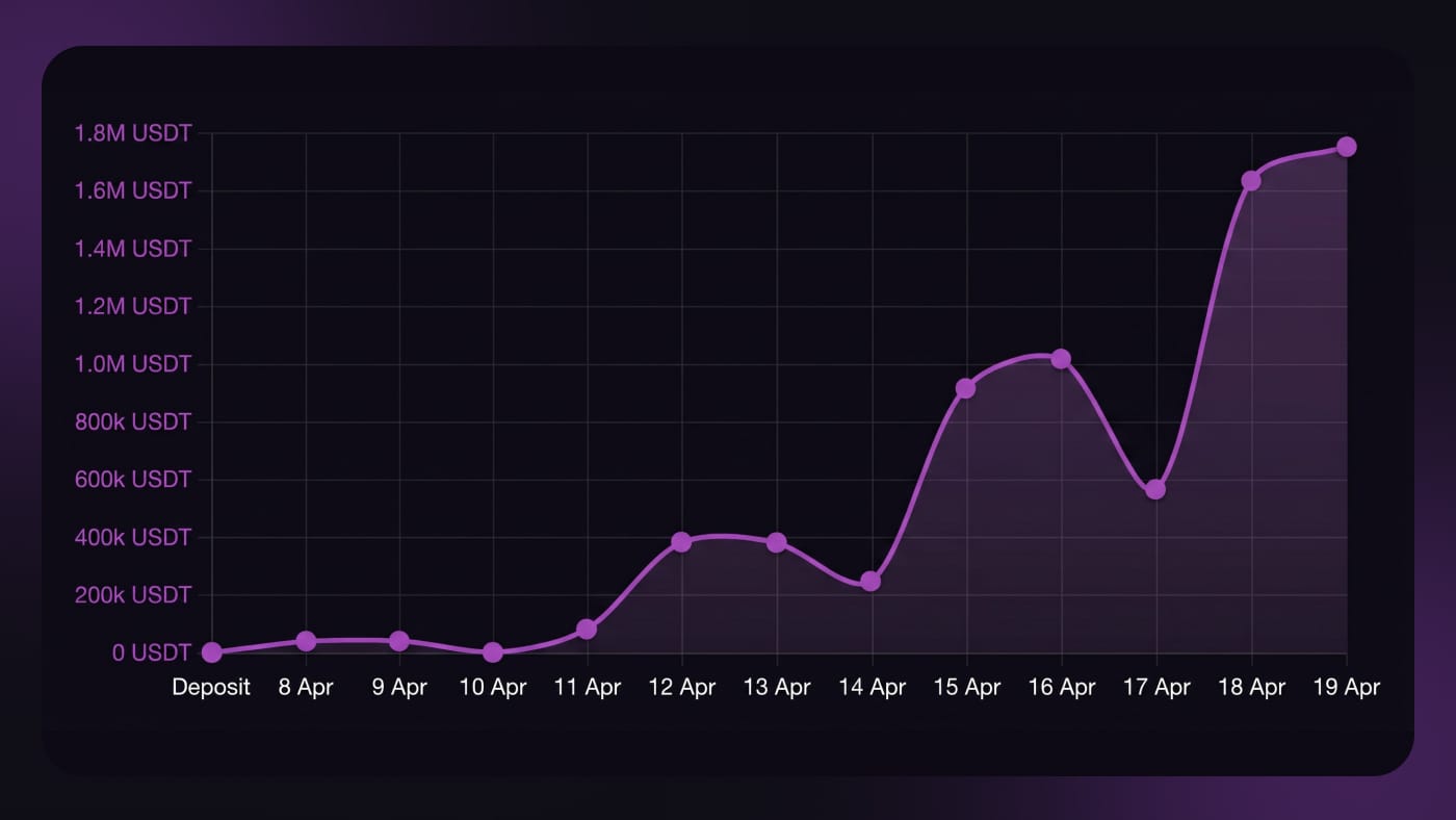 April 8: Viktor Blom deposits 13,626 USDT on Phenom Poker.April 18: Viktor Blom is sitting on 1,750,000+ USDT.