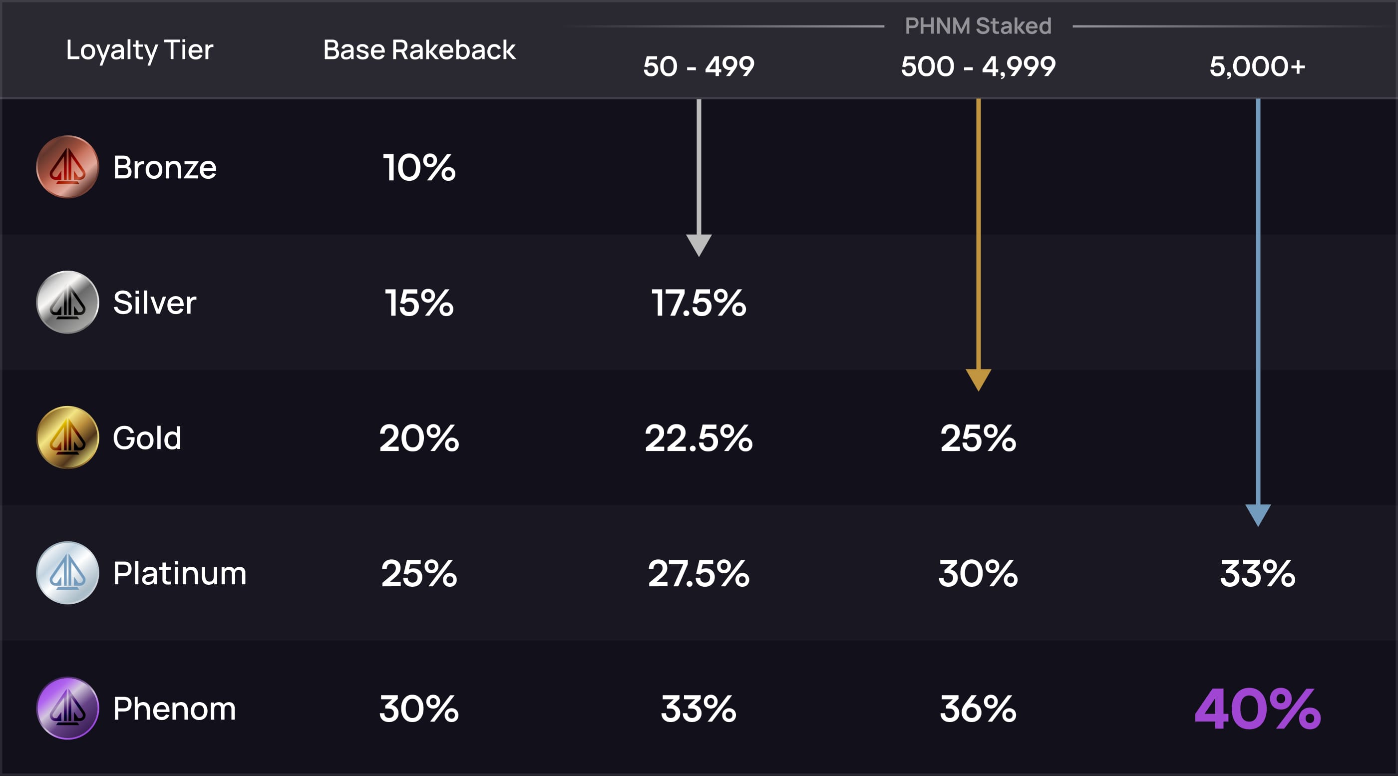 You can still grind your way up the status tiers to earn more rakeback, with no requirement to buy $PHNM. But now, you also have a new way to jump into a higher tier immediately by staking $PHNM.